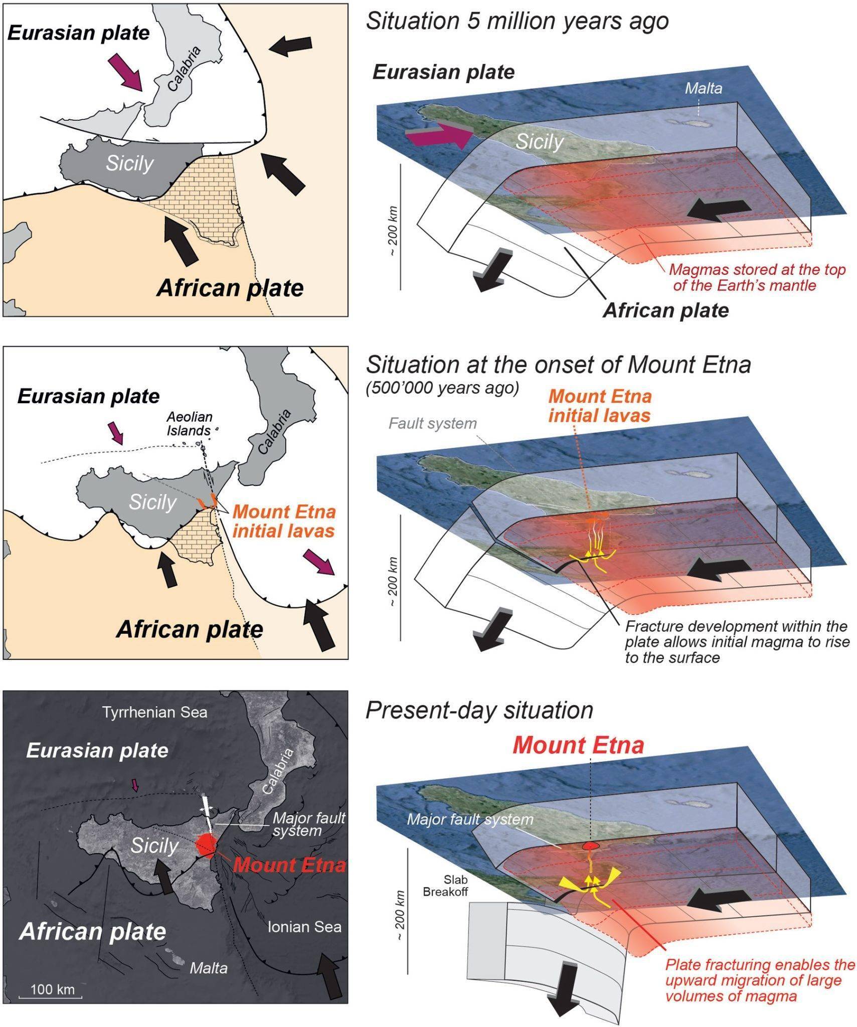 研究團隊指出,埃特納火山的特殊構造環境創造了這種獨特機制。板塊碰撞產生的剪切應力與俯沖帶重力牽引形成合力,在特定區域形成持續的巖漿上升通道。這種介于俯沖帶與熱點之間的過渡形態,為理解火山活動多樣性提供了全新視角,或將改寫現有地質模型中關于火山成因的分類標準。